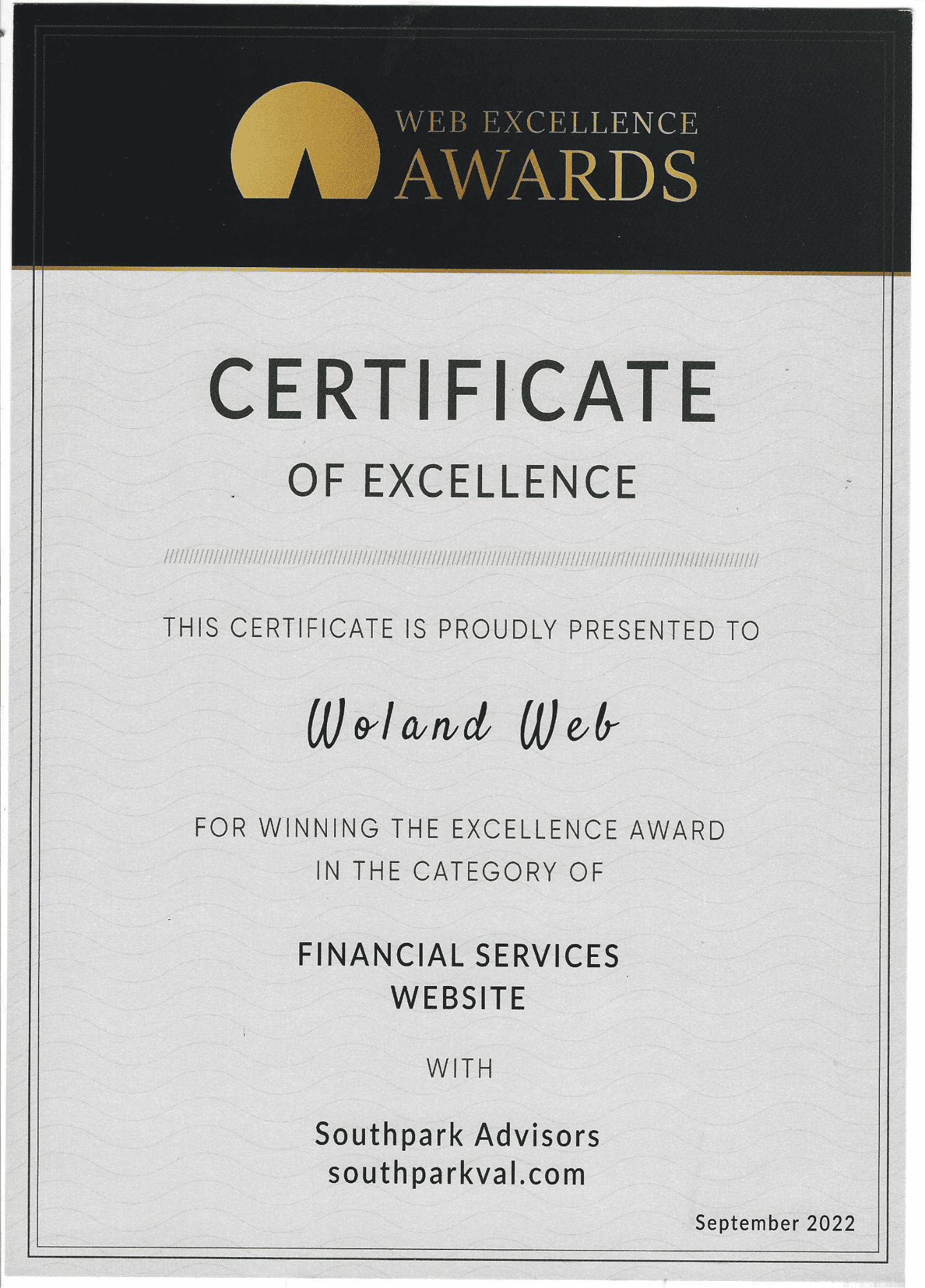 Indeed, we bring up this past client today with a specific purpose in mind—to offer the South Park Advisors team our earnest congratulations. Their website was just awarded a Web Excellence Award, and Woland Web also received recognition for the part that we played in the process.