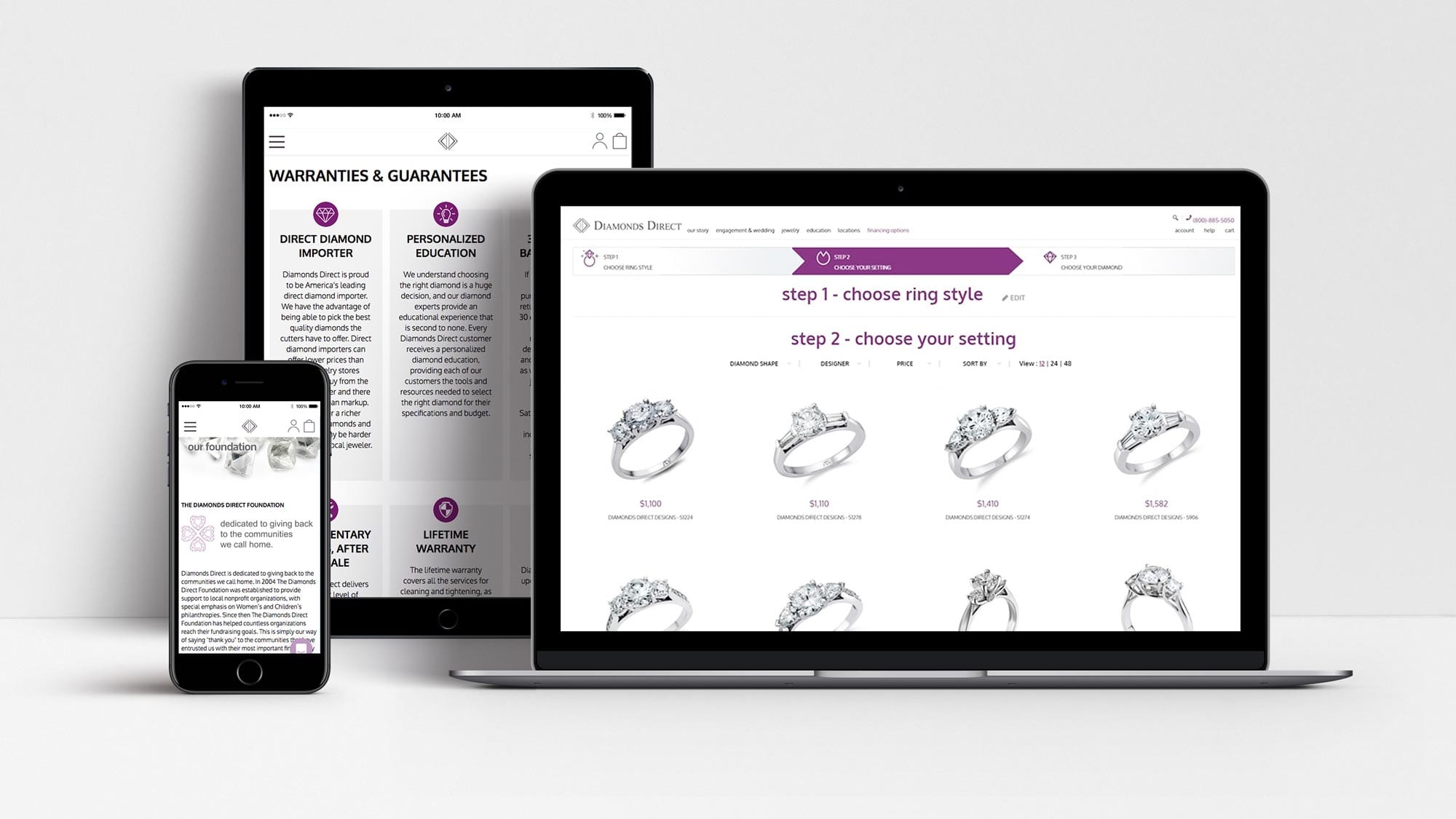 Services provided over the course of 5 years for Diamonds Direct: E-commerce Website Design & Development, Print advertising, Posters, Signs, Billboards, Electronic Newsletters, Digital advertising, Brochures, Collateral materials, business cards, gift certificates, Social Media management on multiple platforms, Facebook contests.