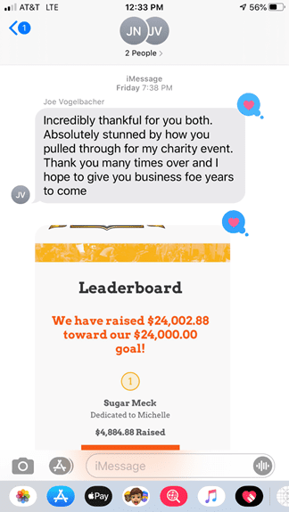 “Incredibly thankful to you. Absolutely stunned by how you pulled through for my charity event. Thank you many times over and I hope to give you business for years to come,” he stated.