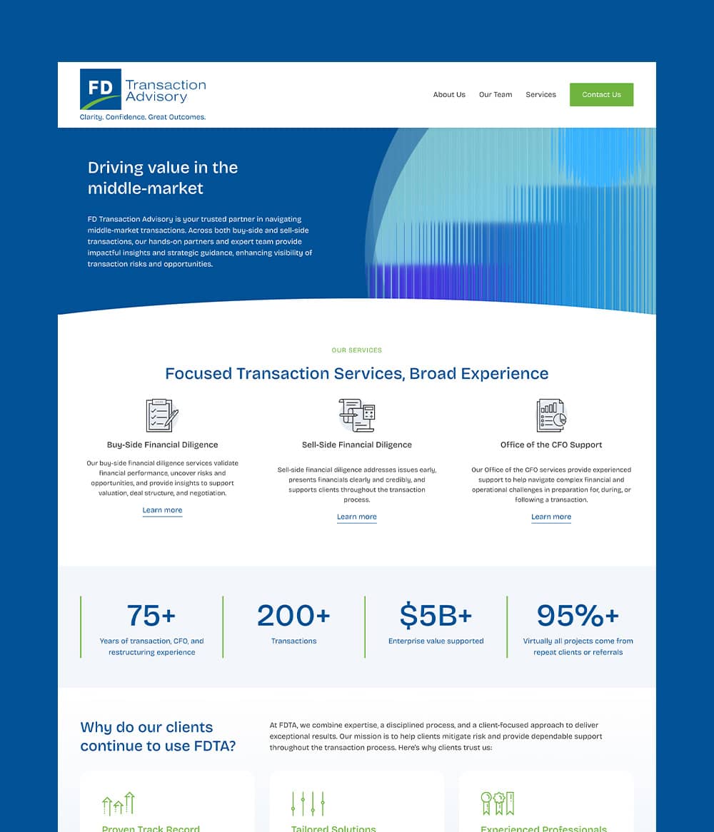 FD Transaction Advisory is your trusted partner in navigating middle-market transactions. Across both buy-side and sell-side transactions, their hands-on partners and expert team provide impactful insights and strategic guidance, enhancing visibility of transaction risks and opportunities.