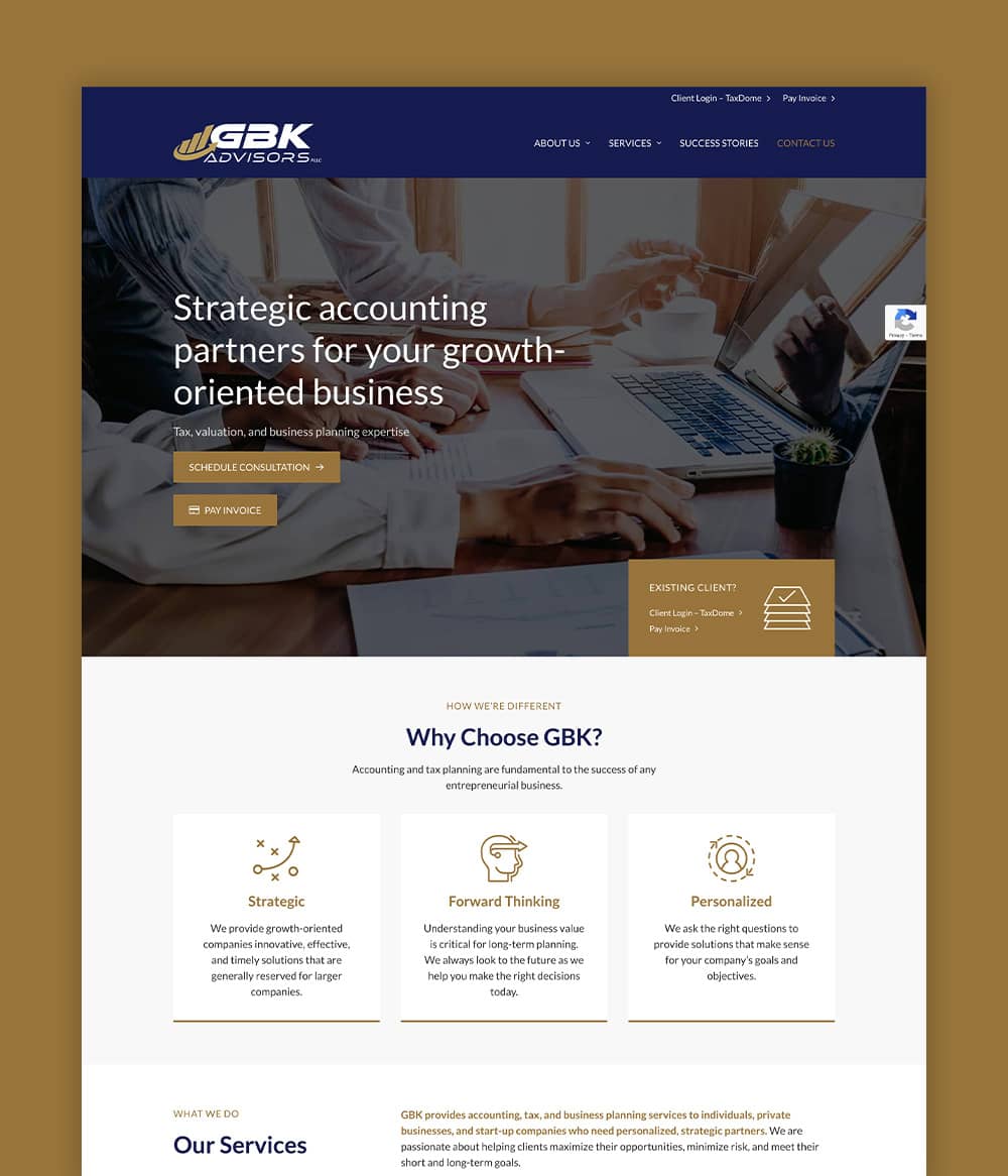 GBK Advisors provides accounting, tax, and business planning services to individuals, private businesses, and start-up companies who need personalized, strategic partners. They are passionate about helping clients maximize their opportunities, minimize risk, and meet their short and long-term goals.